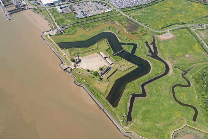 Форт Тилбери, прибрежный форт конца 17 века с бастионами и внешними укреплениями, преимущественно голландского дизайна. Снято с высоты над Темзой, напротив Грейвсенда, Англия. (Фото Historic England Archive):