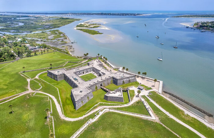 Аэрофотоснимок национального памятника Кастильо-де-Сан-Маркос в Сент-Огастине, Флорида. Форт был построен испанцами и впервые завершен в 1695 году. (Фото Charles LeRette):