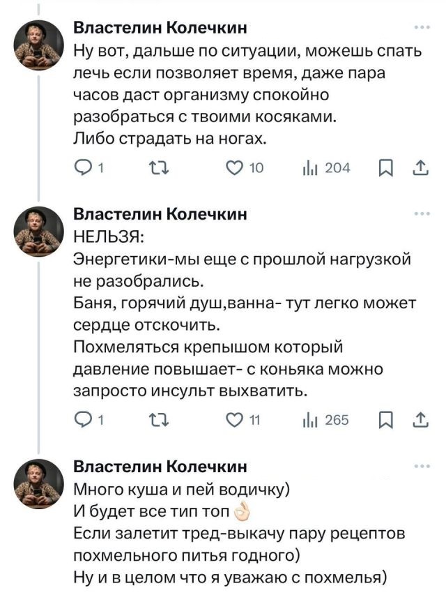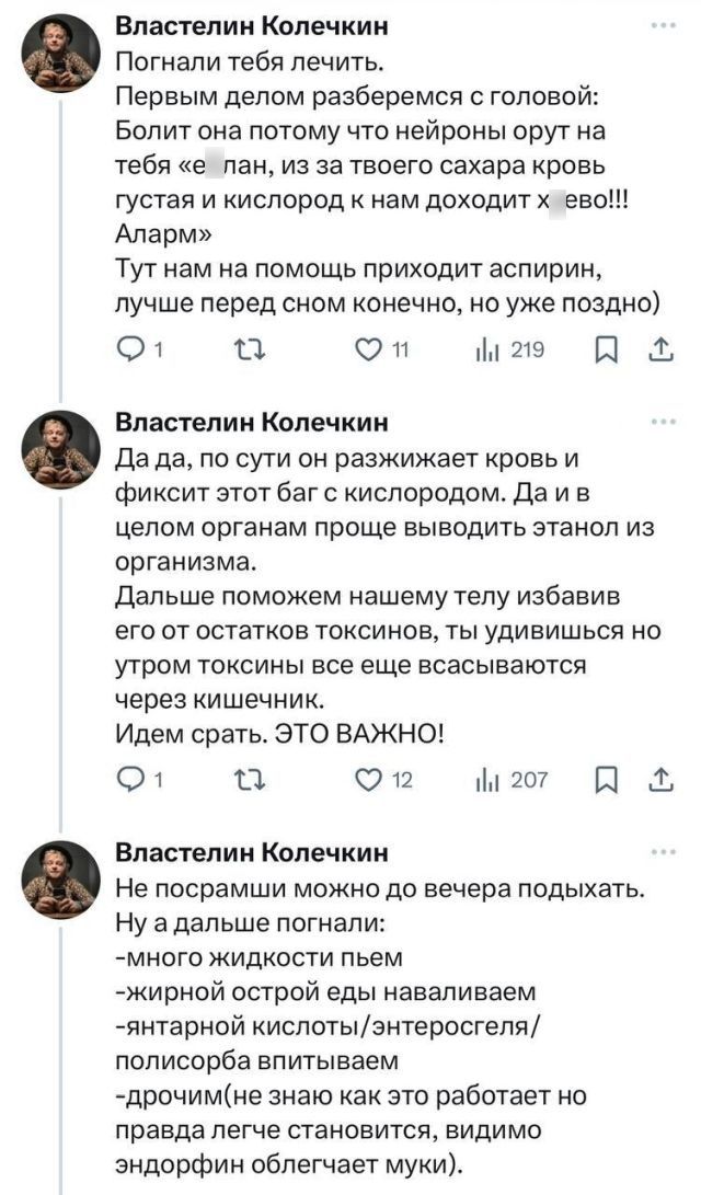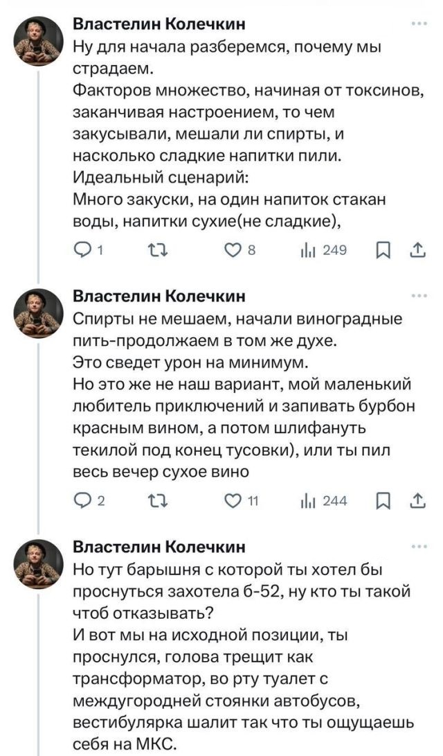 Новогодние корпоративы и праздничные застолья еще не начались, но уже пора готовиться. Как говорится, предупрежден — значит вооружен. Один молодой человек из Твиттера, который разбирается в алкоголе, составил целую ветку о том, как справиться с похмельем. Конечно, похмелья не будет, если умеренно пить и закусывать, но... кого мы обманываем?