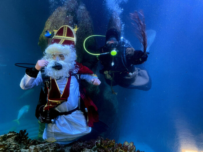 Дайвер в костюме Санта-Клауса кормит акул и рыб в аквариуме в Мальтийском национальном аквариуме в Ауре, Мальта. (Фото Darrin Zammit Lupi):