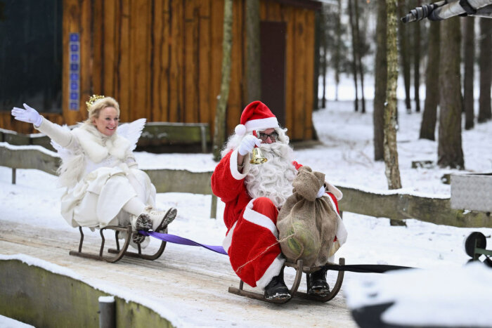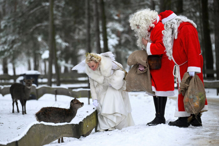 Люди в костюмах Санта-Клауса и ангела едут на санях во время ежегодной встречи в парке животных Гермендорф в Ораниенбурге, Германия. (Фото Annegret Hilse):