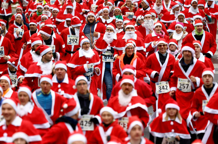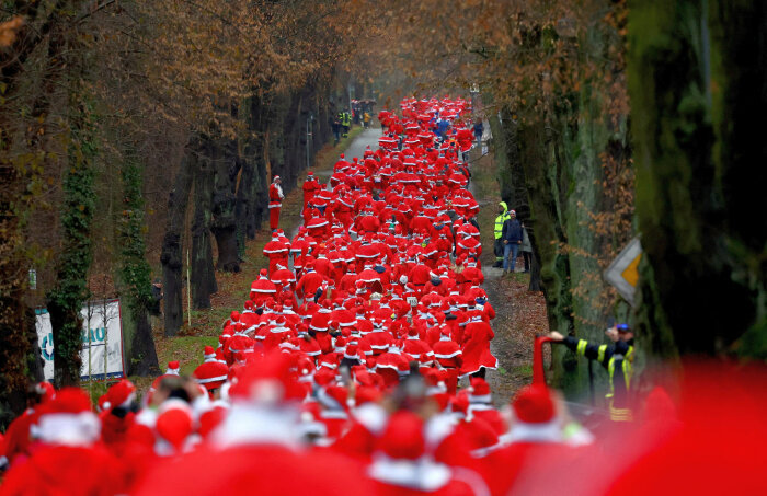Люди в костюмах Санта-Клауса бегут по улицам, принимая участие в ежегодном забеге Николауса Лауфа (Забег Святого Николая) в Михендорфе, Германия. (Фото Lisi Niesner):