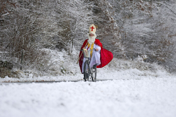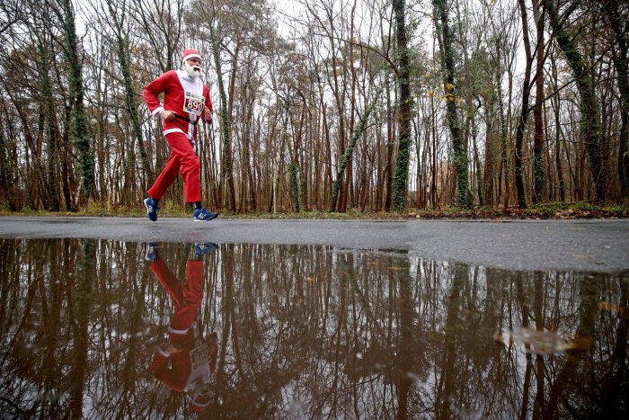 Человек в костюме Санта-Клауса бежит по улицам во время ежегодного Николауса Лауфа (забега Святого Николая) в Михендорфе, Германия. (Фото Lisi Niesner):