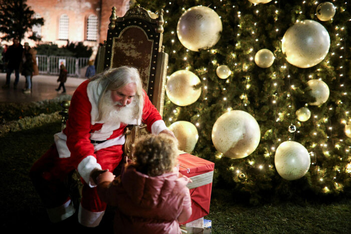 Мужчина в костюме Санта-Клауса разговаривает с ребенком перед рождественской елкой во время церемонии ее зажжения перед собором Александра Невского в Софии, Болгария. (Фото Spasiyana Sergieva):