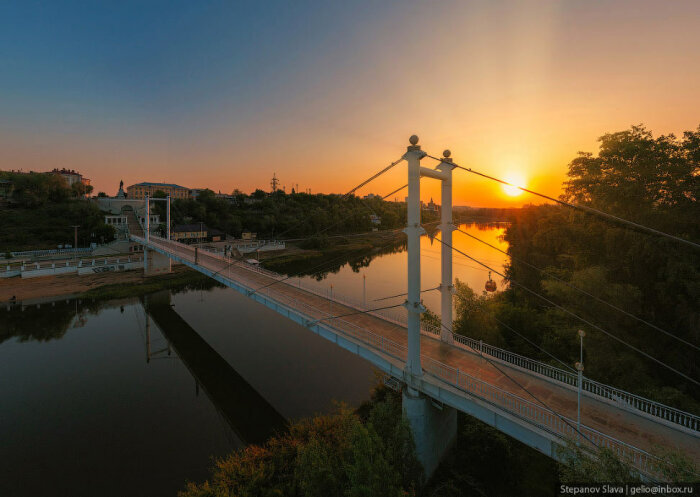 28. Первый пешеходный мост через Урал на месте современного моста «Европа — Азия» построили в 1835 году. В его проектировании принимал участие В. И. Даль, автор всемирно известного Толкового словаря. Это был деревянный наплавной мост, который каждый год убирали на зиму и устанавливали заново после окончания весеннего половодья. Затем наплавной мост заменили на свайный, а в 1982 году построили первый постоянный мост. Это было уникальное по тем временам сооружение — висячий мост системы «арфа». Обычным способом строить мост не получалось из-за слишком крутого обрыва на правом берегу. В результате решили вторую половину поста собирать на берегу, а затем монтировали части прямо над рекой.