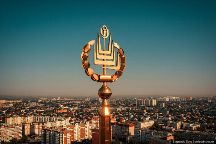 18. На шпиле Научной библиотеки — герб ОГУ. Знак символизирует мыслящего человека, который возвышается над ступенями зданий.