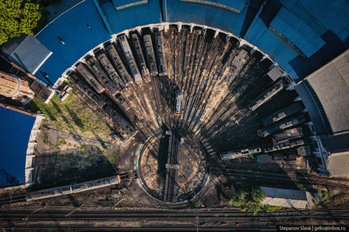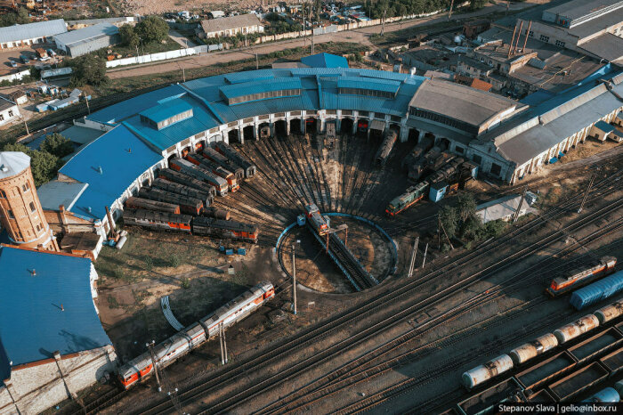 51. Поворотные круги в локомотивных депо сейчас сохранились далеко не везде. Где-то их до сих пор используют по прямому назначению, в других депо оставили как музейных экспонат. Локомотивное депо Оренбурга — одно из немногих, где ввод локомотивов на ремонтную позицию выполняется при помощи веерного поворотного круга.