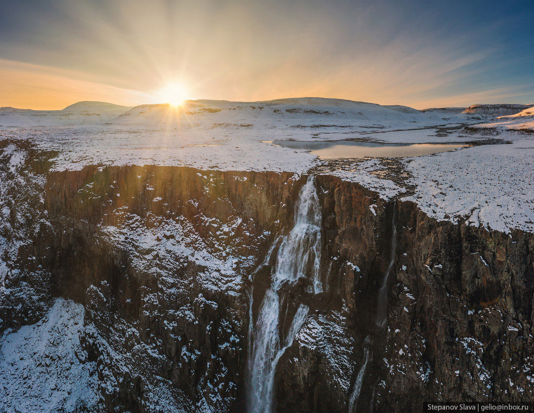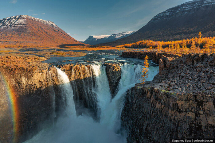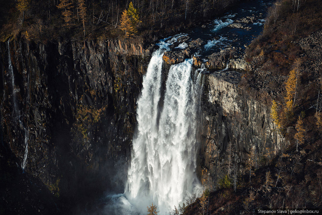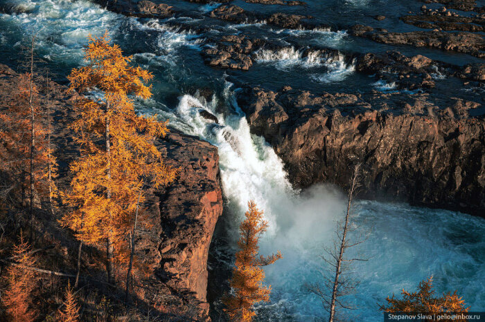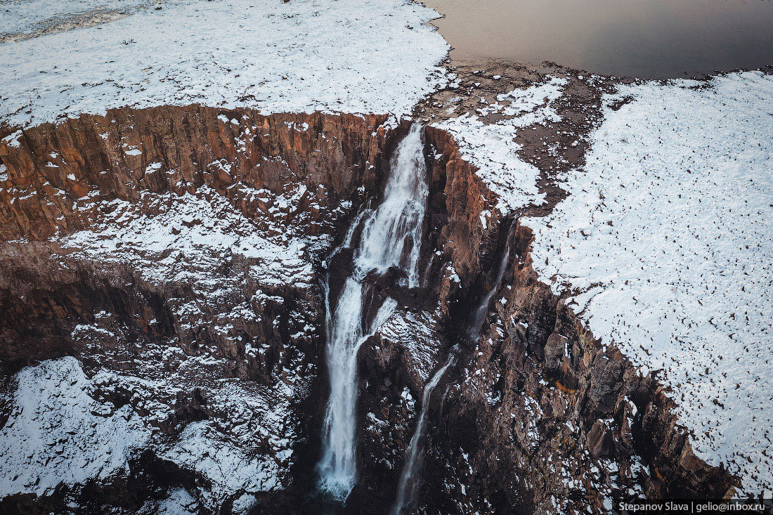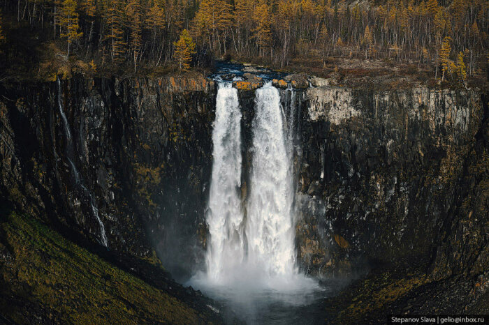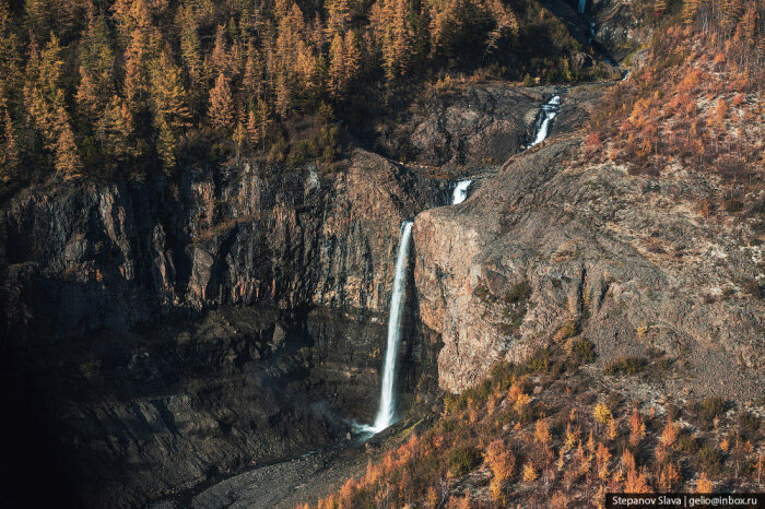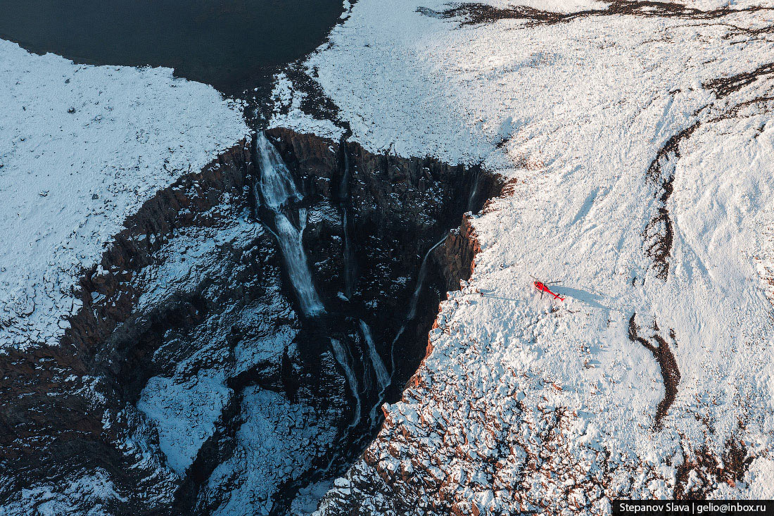 10. Водопад находится на одном из бесчисленных безымянных ручьёв плато. Добраться сюда можно на вертолёте либо забросившись по воде до озера Ламы или Собачьего, а дальше пройти пешком.