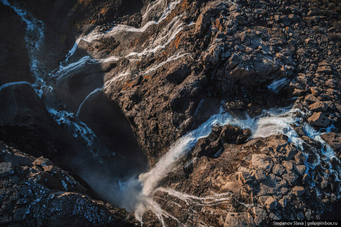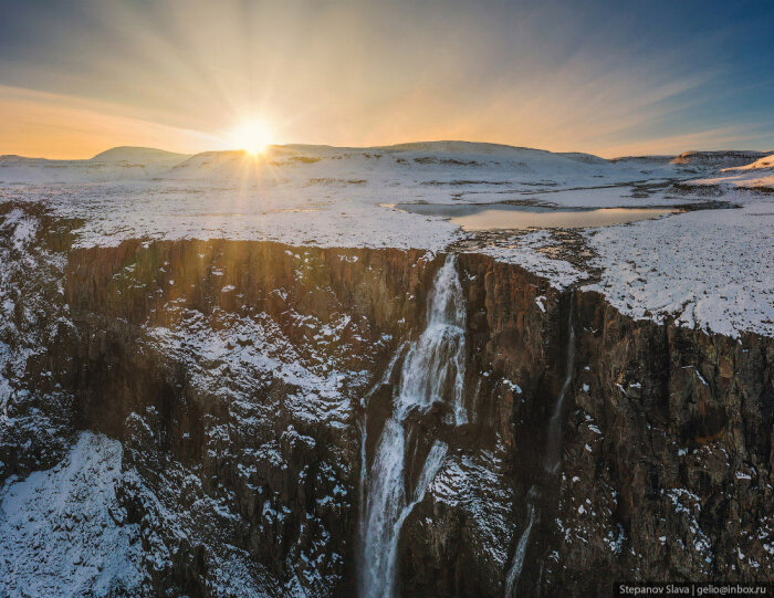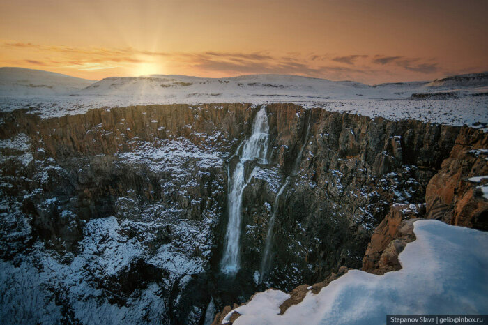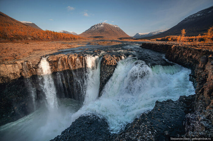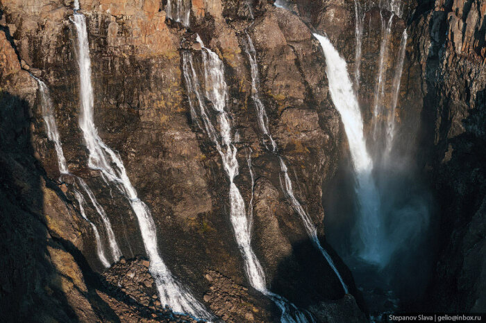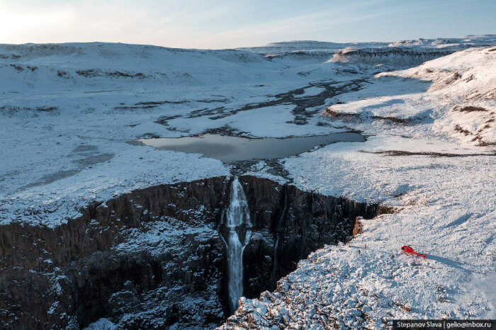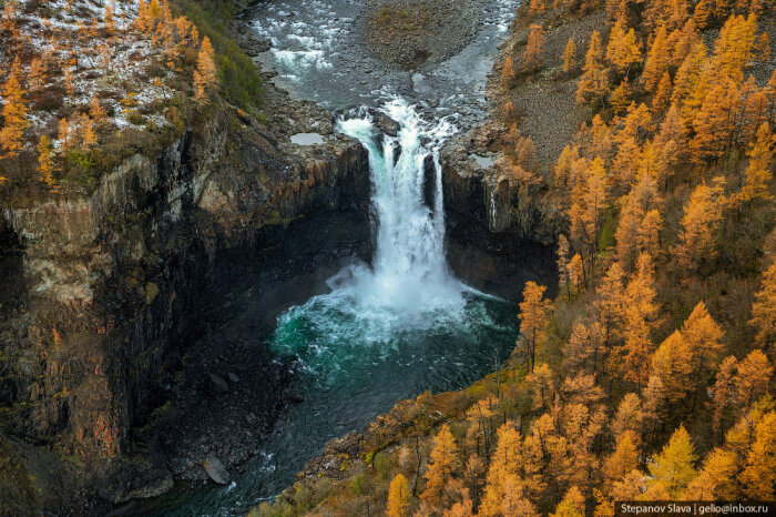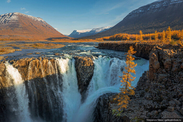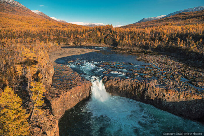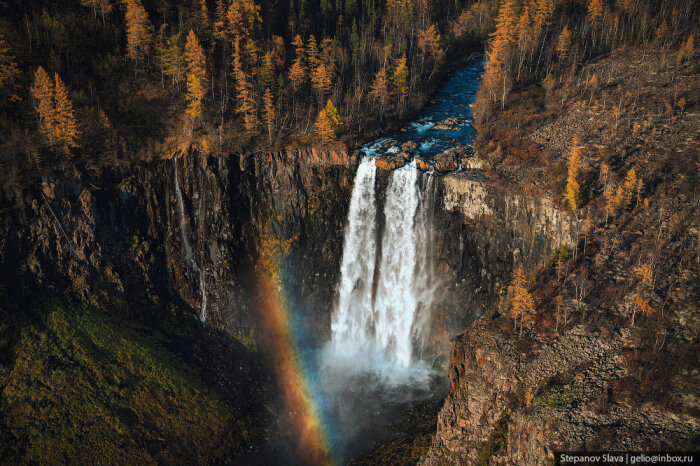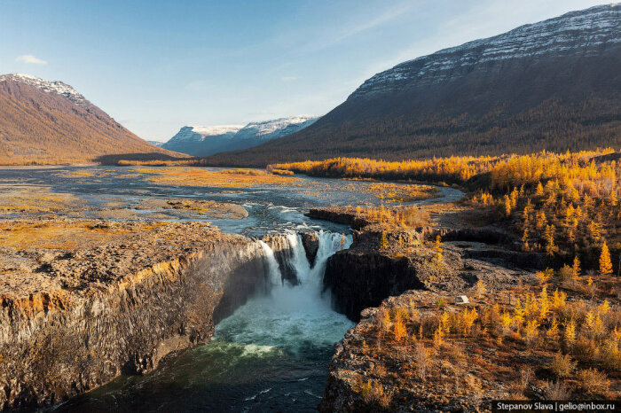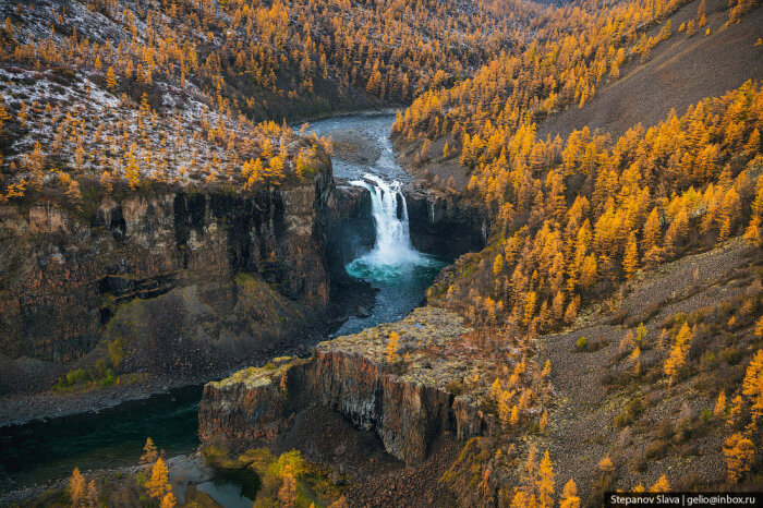 10. Водопад находится на одном из бесчисленных безымянных ручьёв плато. Добраться сюда можно на вертолёте либо забросившись по воде до озера Ламы или Собачьего, а дальше пройти пешком.
