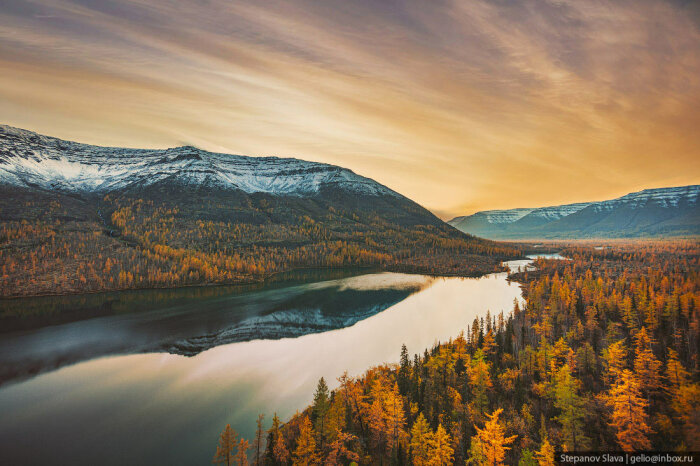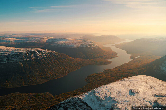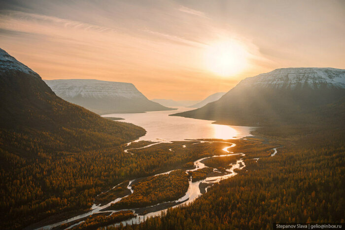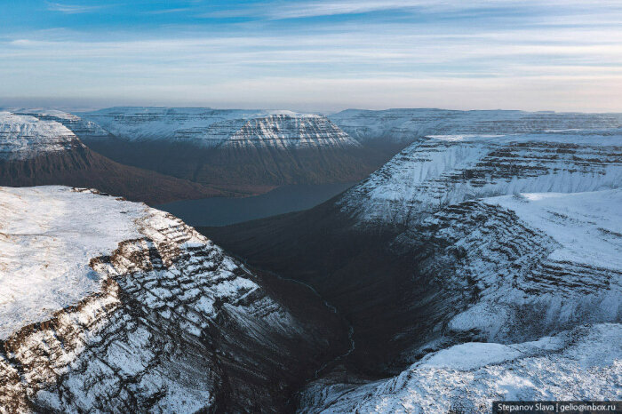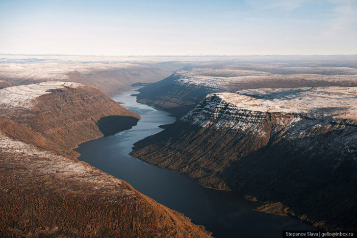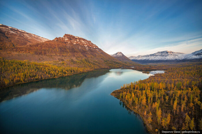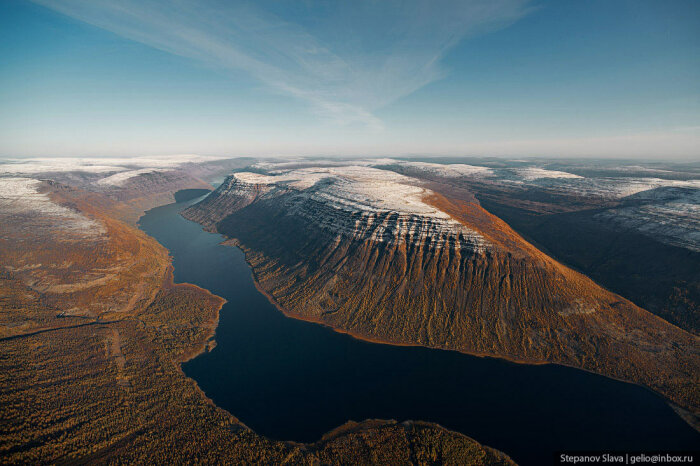 16. Озеро Дюпкун. Система озёр плато Путорана уникальна. Озёр здесь более 22 тысяч и они занимают около 10% площади плато. Нигде в мире на ограниченной площади нет такого количества длинных (50–150 км) и глубоких (50–420 м) озёр, как на плато Путорана.
