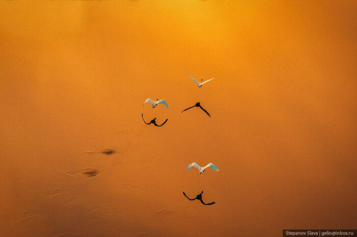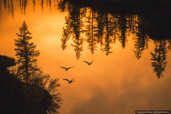 28. В водных и околоводных ландшафтах плато Путорана гнездится множество видов птиц. В том числе — лебеди.