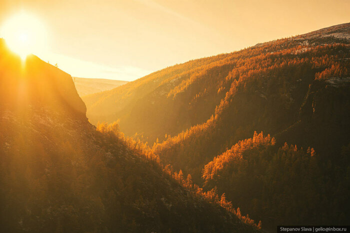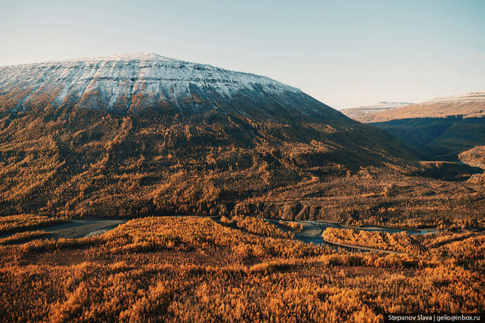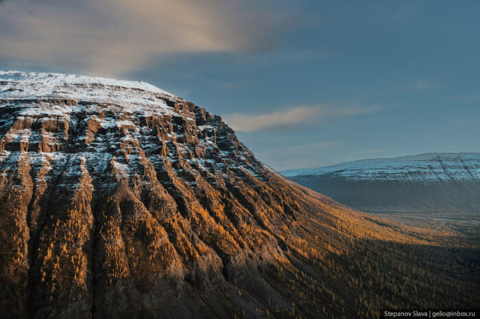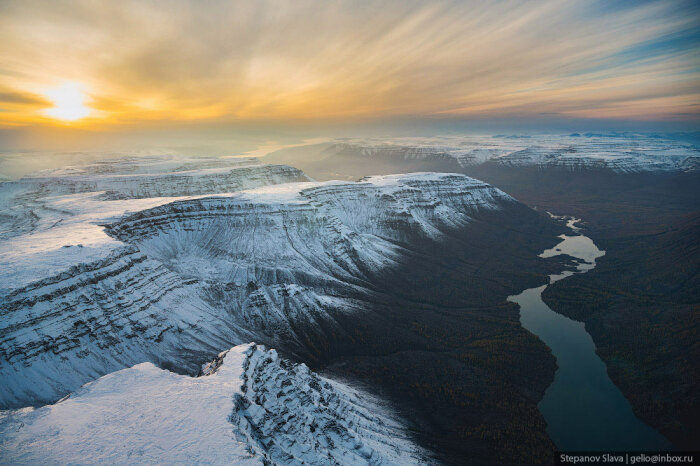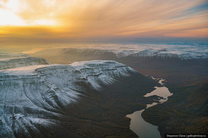 Площадь плато Путорана 250 тысяч квадратных километров — больше, чем Великобритания. Горы образовались около 250 млн лет назад, до этого плато находилось на уровне моря. Извержения здесь длились несколько десятков млн лет, магма выходила большими потоками, застывала слой за слоем и образовывала плоские базальтовые горы (траппы). Сейчас высота максимальной точки плато около 1700 метров. Большую часть года на плато лежит снег, а во время короткого лета образуется бесчисленное число водопадов, ручьёв, рек и озёр. По запасу пресной воды у плато второе место в России после Байкала.