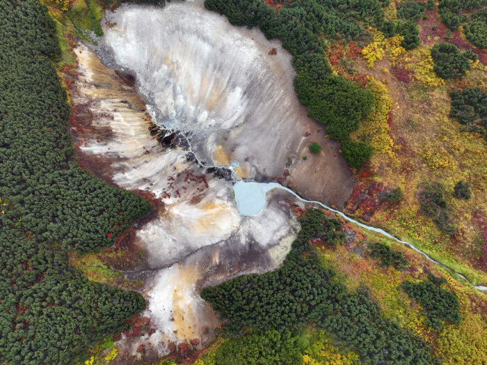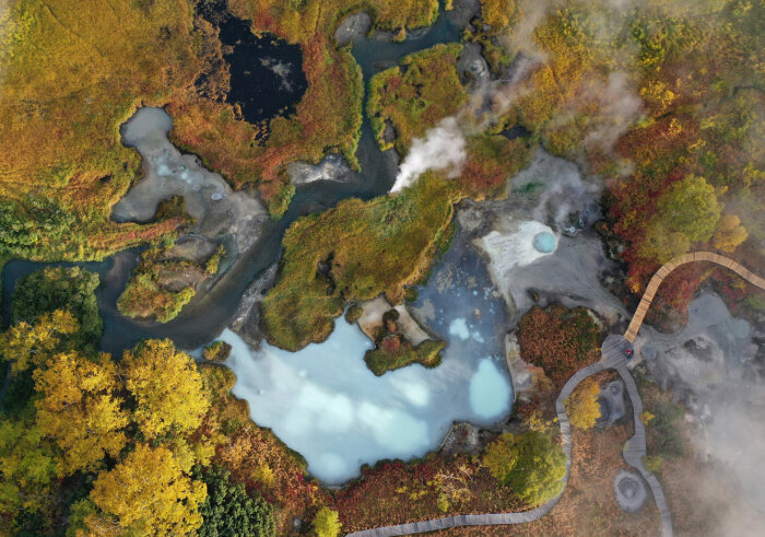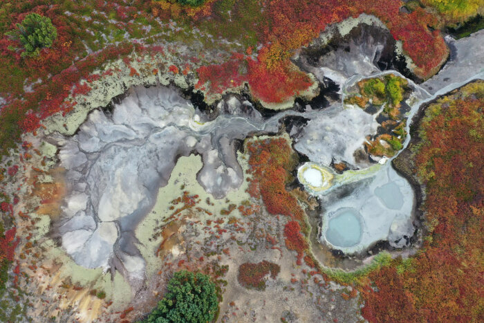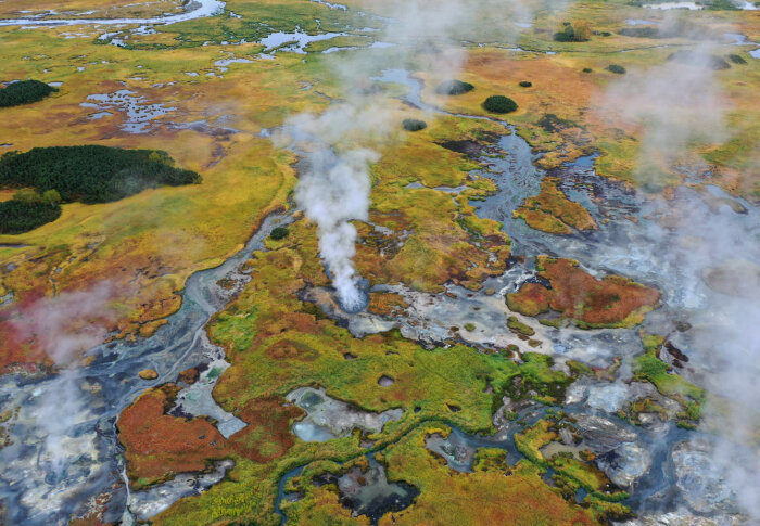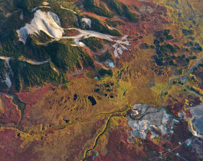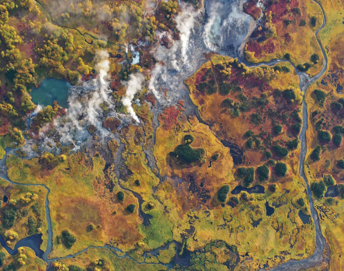 Жаль покидать и Долину гейзеров и кальдеру вулкана Узон. Вот небольшая подборка узонных красот, снятых с высоты птичьего полета. Все разновидности горячих источников, термальные участки, озера разных размеров, ручьи, болота, ягодники.