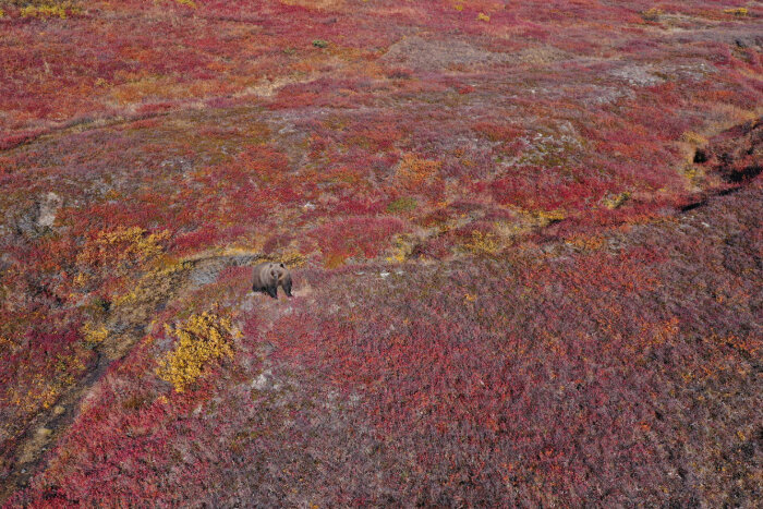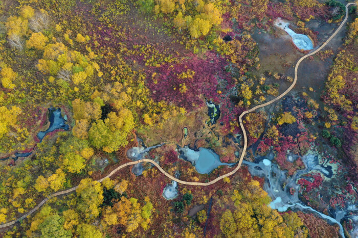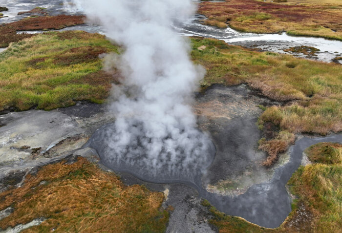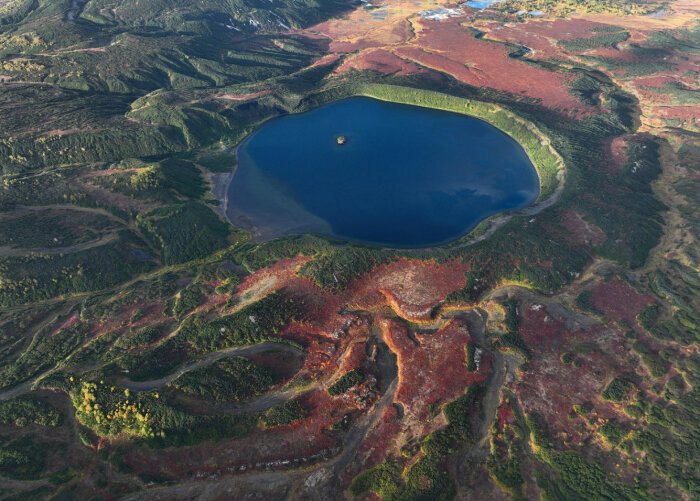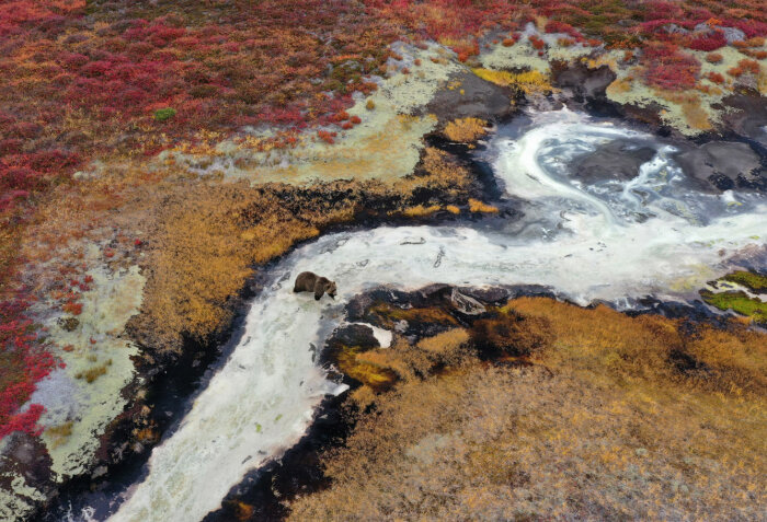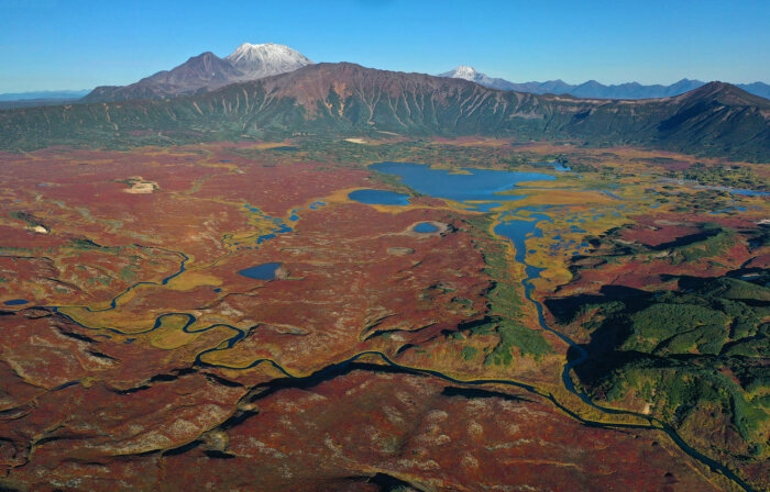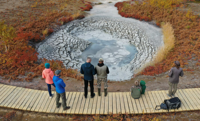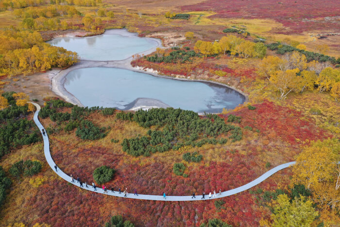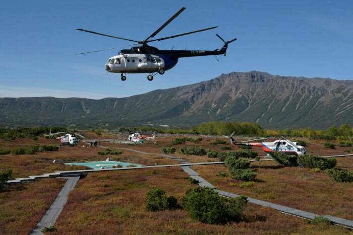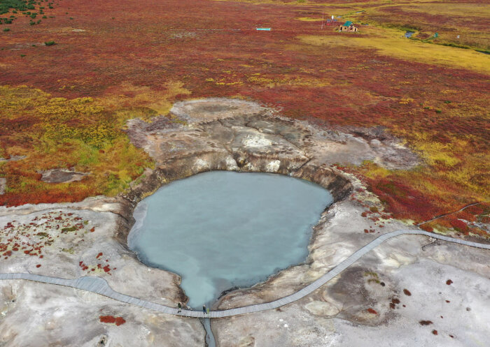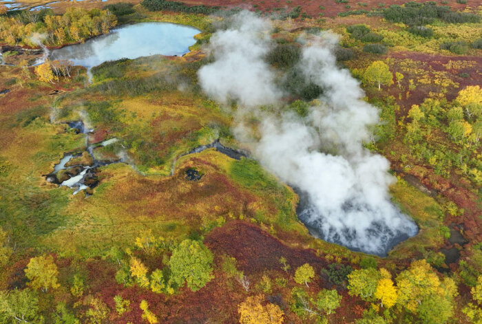 Каждый погожий день в кальдеру Узона прилетают туристы. К фумаролам и горячим озерам бонусом прилагается чудесная золотая осень и наблюдение за мишками, которые пасутся на здешней ягодной тундре.