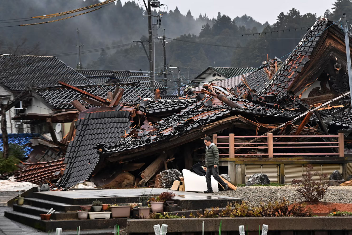 Мужчина проходит мимо обрушившегося дома в городе Анамидзу, префектура Исикава, 3 января 2024. (Фото Kazuhiro Nogi):