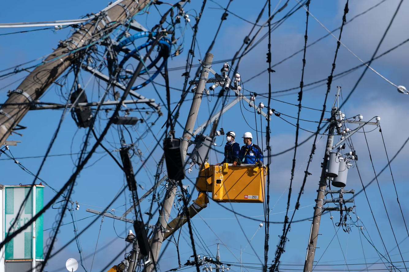 Рабочие коммунальных предприятий ремонтируют линии электропередачи после землетрясения в Сузу, Япония, 4 января 2024. (Фото Tomohiro Ohsumi):