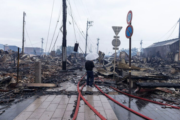 Мужчина смотрит на здания, разрушенные пожаром после землетрясения, в Вадзиме, Япония, 3 января 2024. (Фото Buddhika Weerasinghe):