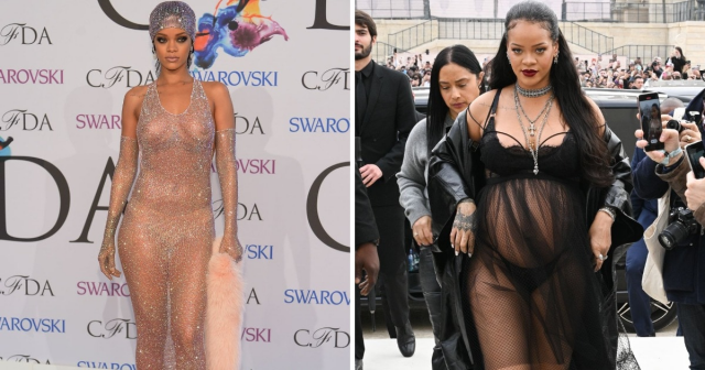 Певица в 2014 году и 2022 не изменяет традиции «голых платьев» в своём гардеробе даже будучи беременной.