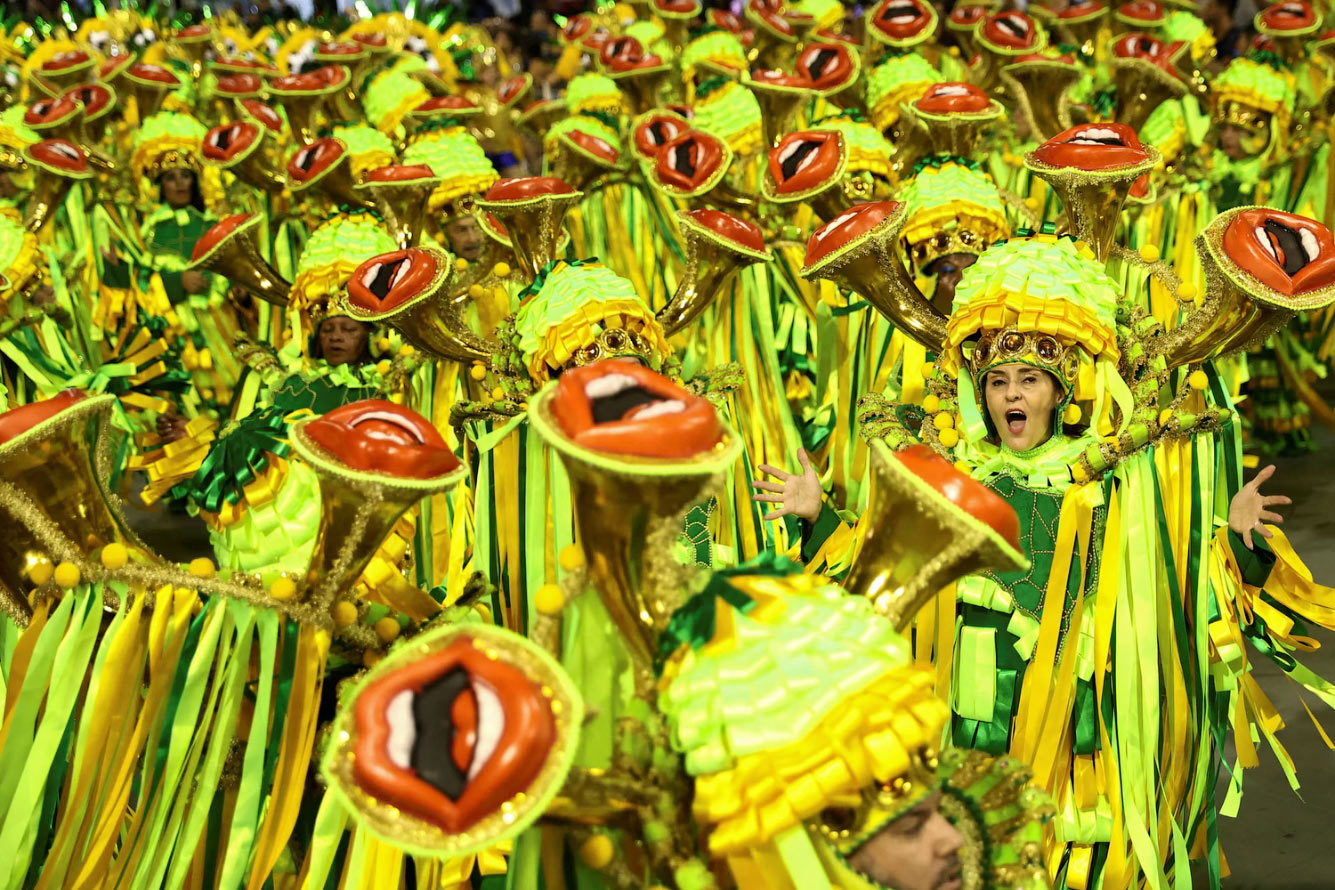 Вивиан Араужо из Салгейру, королева барабанов, выступает во время карнавальных парадов 2024 года на самбадроме Сапукаи 11 февраля 2024 года в Рио. (Фото Buda Mendes):