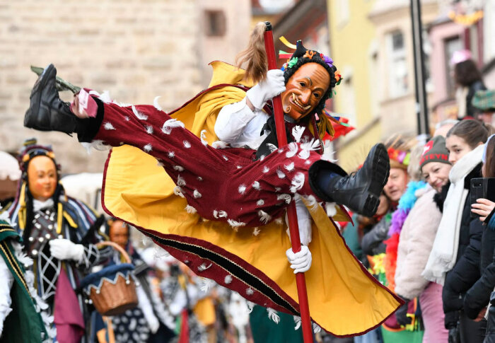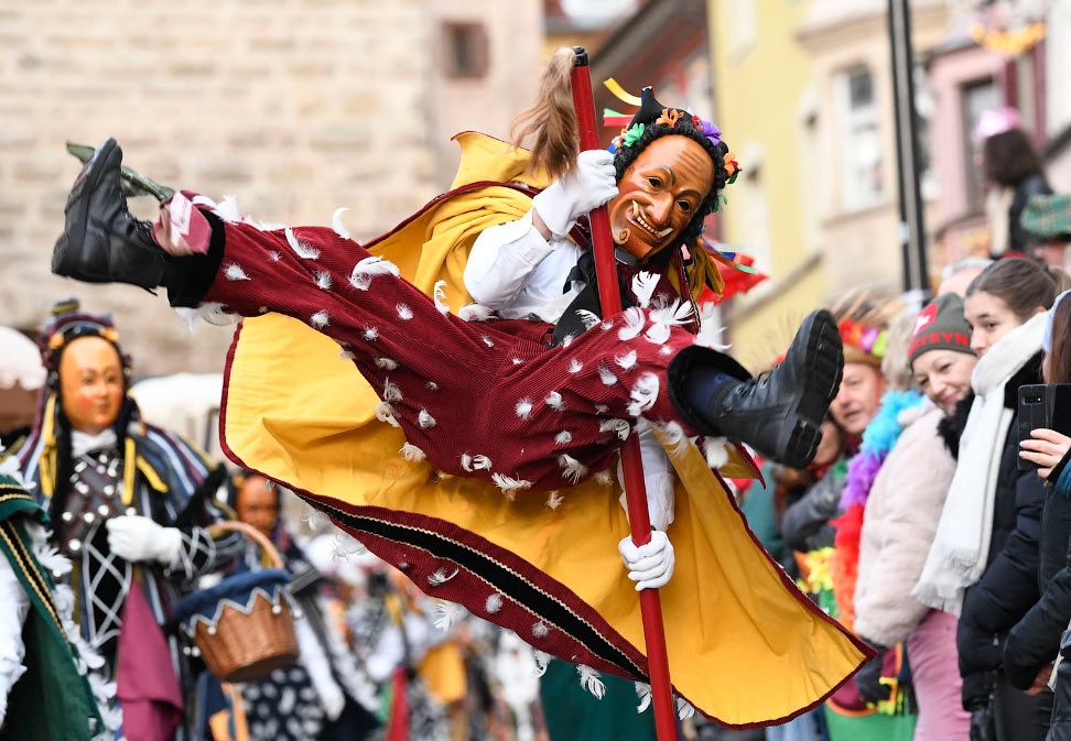Персонаж карнавала «Федерханнес» прыгает на улицах Ротвайля, Германия, во время карнавального парада Нарренспрунг («Прыжок дураков»). (Фото Thomas Kienzle):
