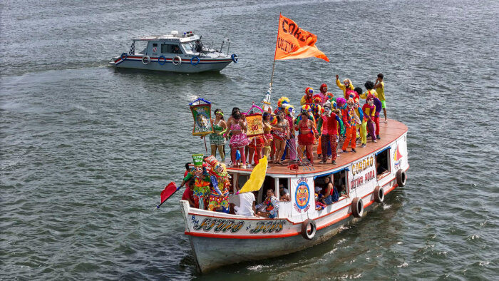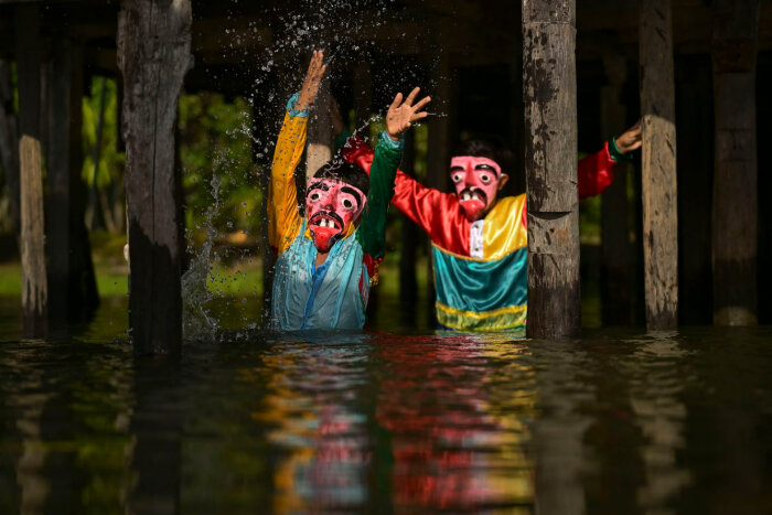 Молодые члены «Bloco os Linguarudos» в воде в масках во время «Carnaval Das Àguas». (Фото Pedro Vilela):