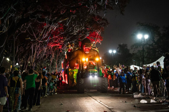 Парад Креве Бахуса. Парад Марди Гра в Новом Орлеане, участниками которого являются собаки, одетые в соответствии с центральной темой парада. Ежегодное мероприятие организовано Krewe of Barkus, некоммерческой организацией, которая способствует усыновлению и спасению бездомных животных в Новом Орлеане. (Фото Erika Goldring):