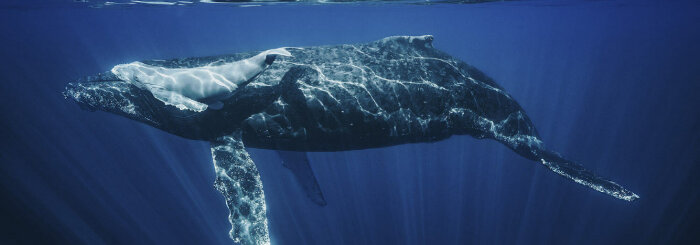 Вид матери-горбатого кита и ее драгоценного детеныша, скользящих по кристально чистым глубинам океана. (Фото Ricardo A. Nascimento):