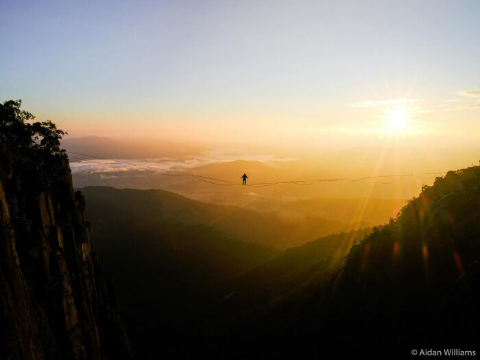 Канатоходец покоряет захватывающие дух высоты Тасмании, захватывая захватывающие высоты и величественные просторы на восходе солнца. (Фото Aidan Williams):