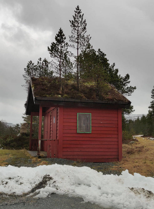 В Норвегии частенько можно встретить дома с подобной крышей. Она отлично сохраняет тепло и защищает от непогоды. В прошлом норвежцы использовали подобную технику строительства крыши, чтобы маскировать свои жилища от врагов.