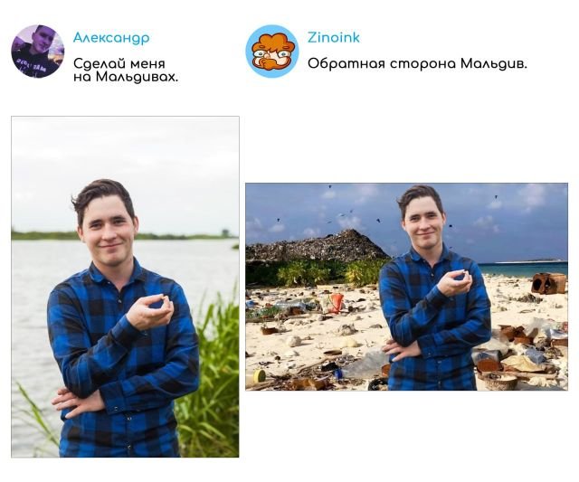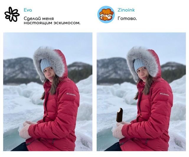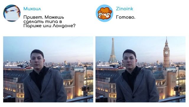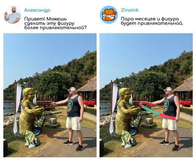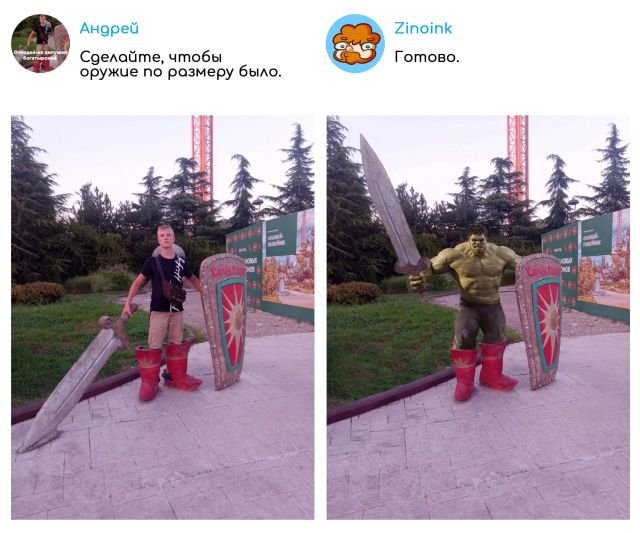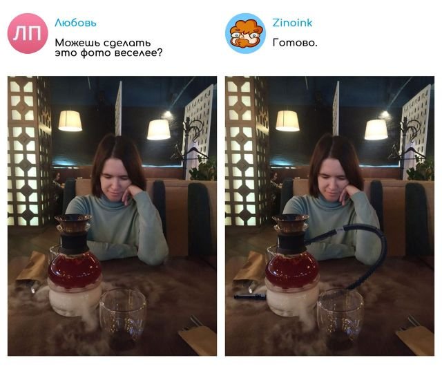 Далеко не все умеют пользоваться фотошопом. Да, теперь есть удобные фоторедакторы в каждом смартфоне, но инструментарий там весьма ограничен. Но если среди знакомых есть фотошоп-умелец, то можно обратиться к нему за подмогой. Но коль таковых нет, то не печальтесь. На помощь всегда придет Zinoink. Он бесплатно исправит ваш снимок. Но... будьте аккуратны со своими пожеланиями!