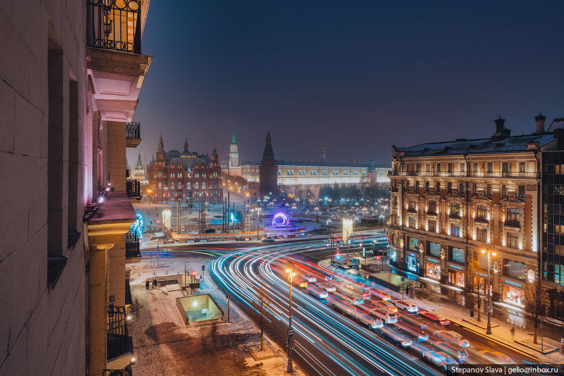 14. Тверская улица, Манежная площадь. Под площадью расположен торговый комплекс Охотный ряд с тремя подземными уровнями.