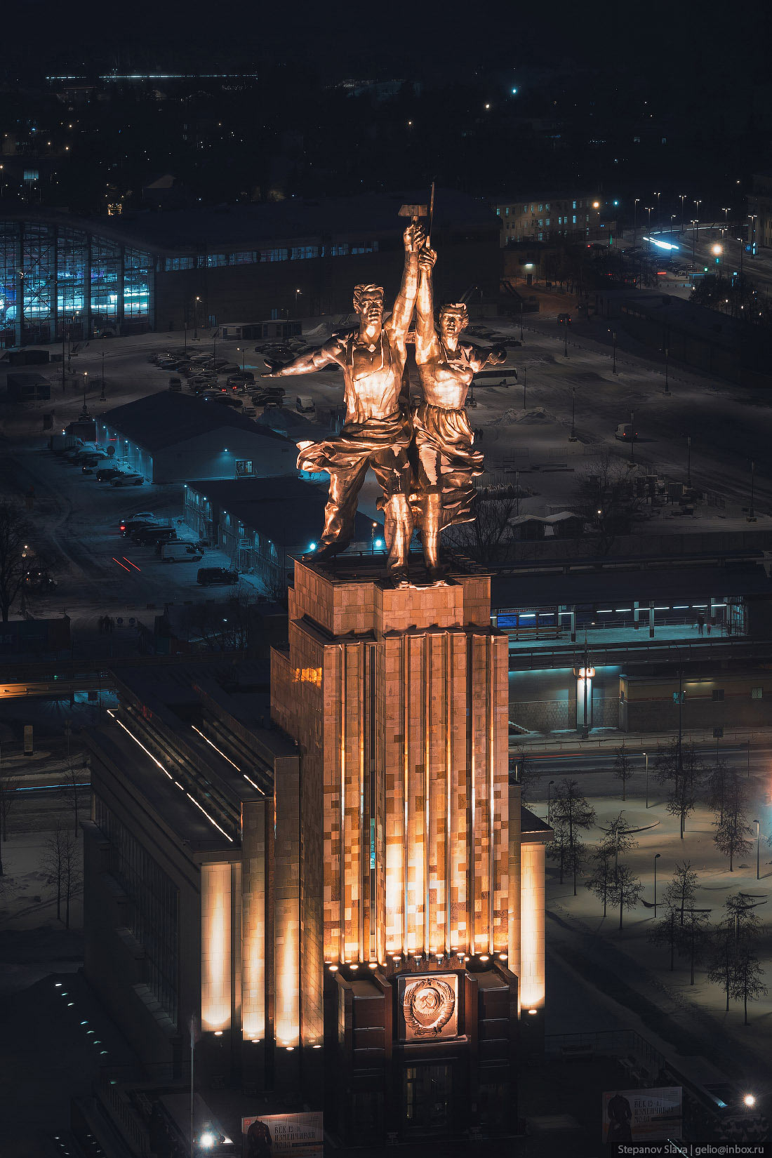 21. Арка главного входа ВДНХ. На вершине установлена композиция «Тракторист и колхозница». Скульптура олицетворяет единение промышленности и сельского хозяйства. Фигуры выполнены из бетона, сноп колосьев — из латуни. С учётом памятника, высота конструкции достигает 32 метров.