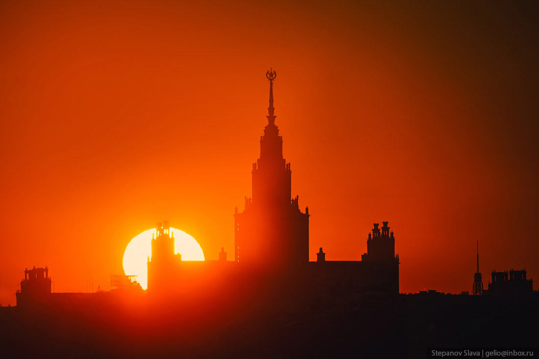 30. Главное здание МГУ симметрично относительно центральной башни — от неё отходят одинаковые 18-этажные «крылья». На башнях установлены огромные часы, термометр и барометр.