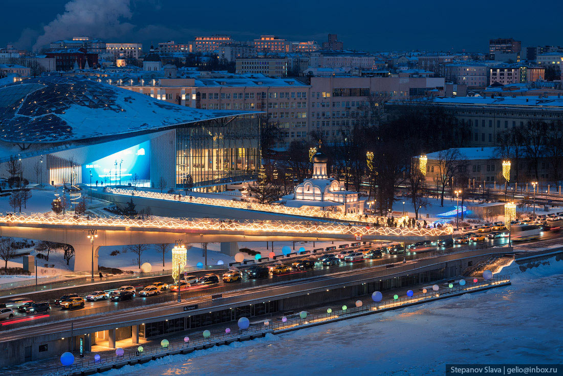 12. Парк Зарядье и набережная Москвы-реки. Лёд уже затянул реку, но пути, по которым проходят речные трамваи, различить можно.