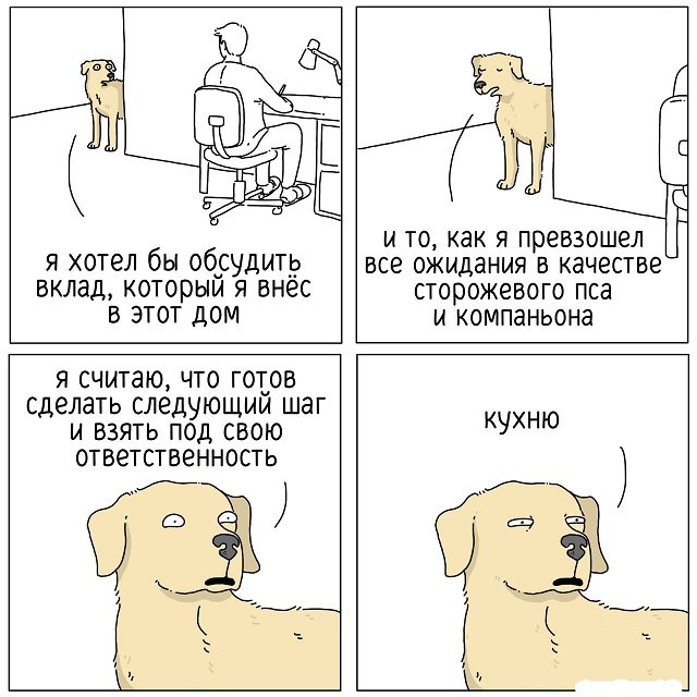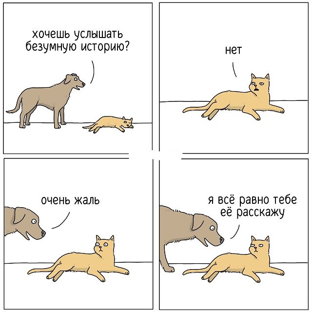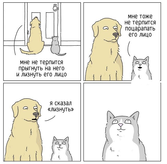 Если вы слышите, как разговаривают животные и понимаете их язык, то надо быстренько собирать вещи и ехать в психиатрическую клинику. Но фантазировать о мыслях и беседах наших любимых питомцев - это нормально! Более того, об этом можно даже писать забавные комиксы, как автор этих веселых сюжетов. Давайте посмотрим.