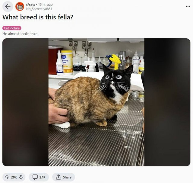 Мужчина уже довольно давно живет с этим пушистым красавцем, но какой он породы - никто не может сказать. Пользователи и вовсе думали, что все это нейросеть. Поэтому пришлось вести котейку к ветеринару... И там все выяснилось.Порода называется Менуэт или Наполеон, а раскрас – это необычная мутация.