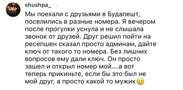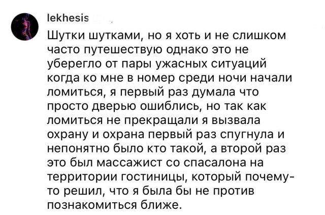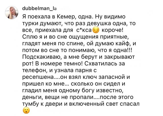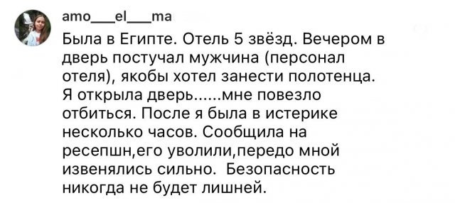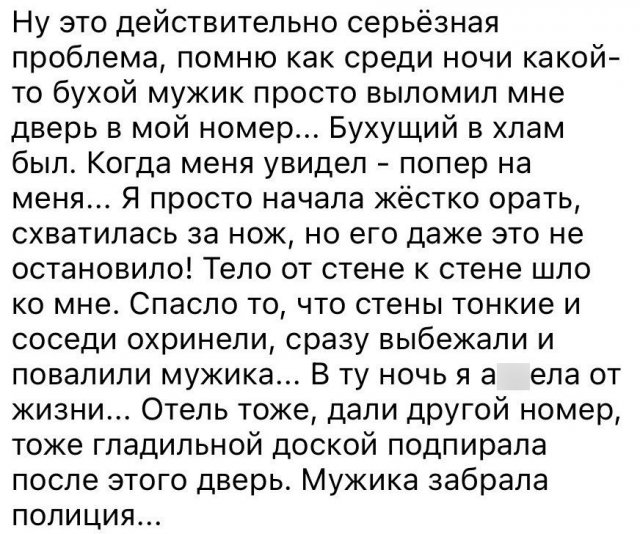 Хотели бы оказаться сейчас на песчаном берегу, с пальмами, смотря на море или океан? Думаю, многие бы хотели. Сейчас самыми популярными направлениями, как и обычно, являются Египет, Турция, Вьетнам, Таиланд и подобные. И девушки решили поделиться историями с отдыха в этих странах. Истории довольно жуткие - от мужиков, которые ломятся пьяными в номер, до странных дверей в номерах.