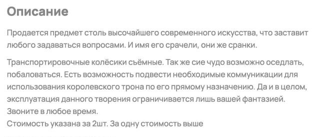 Походы в туалет... вряд ли можно назвать каким-то элегантным занятием. Да и вообще в приличном обществе этот естественный процесс жизнедеятельности организма лучше не обсуждать... Но так было до сегодняшнего дня! В Санкт-Петербурге выставили на продажу изысканные туалеты-качели. Это не просто унитаз, а произведение искусства, которое подойдет не только для справления нужд, но и для забавы. А если купить два таких "фарфоровых скакуна", то можно и потешные гонки устраивать. Гости будут в восторге! Прыгайте в седло, пока не раскупили. Предложение ограничено, а цена до неприличия мала - несчастные 40 тысяч рублей. Смехотворная стоимость за такое уникальное произведение санитарно-технического искусства.