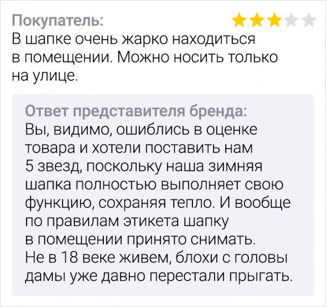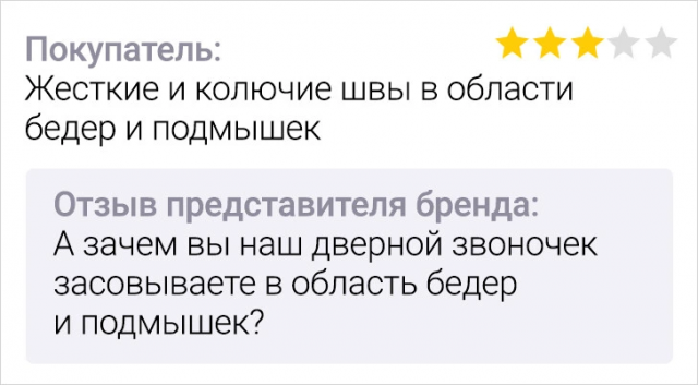 Отзывы уже давно стали самостоятельным комедийным поджанром в Сети. Их остроумные авторы далеко не всегда дают четкую информацию о товаре, но читать их комменты всегда весело. Но и сами продавцы от них не отстают и порой дают очень смешные и колкие ответы. Давайте поднимем себе настроение и поглядим новую подборку отзывов с просторов Сети.