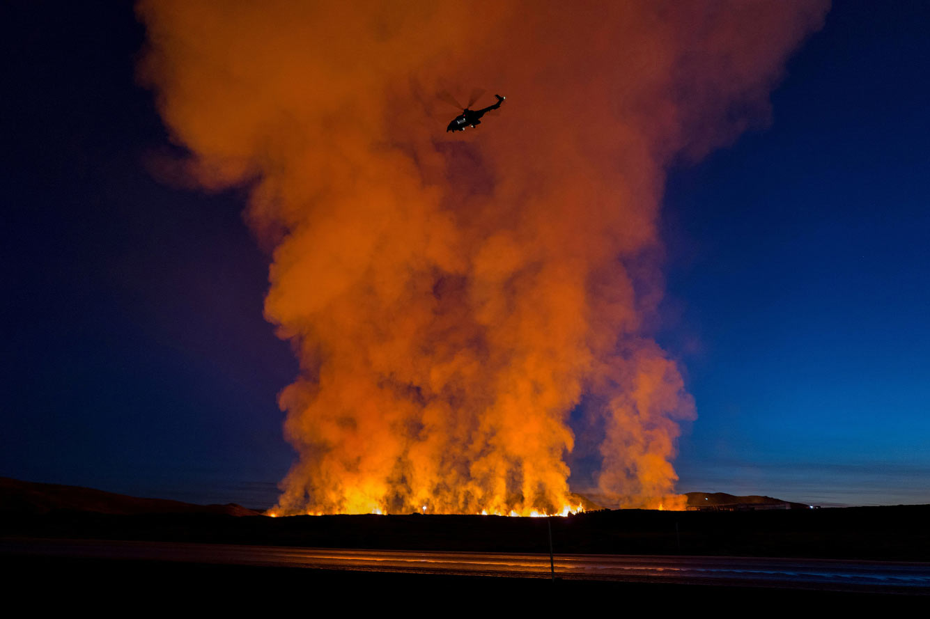Вертолет пролетает над дымом, поднимающимся во время извержения вулкана в Гриндавике, Исландия. (Фото Icelandic Coast Guard):
