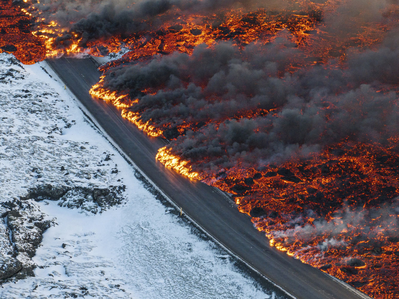Вид лавы, пересекающей главную дорогу, ведущую в Гриндавик, и текущей по дороге, ведущей к Голубой лагуне, в Гриндавике, Исландия. (Фото Marco Di Marco):
