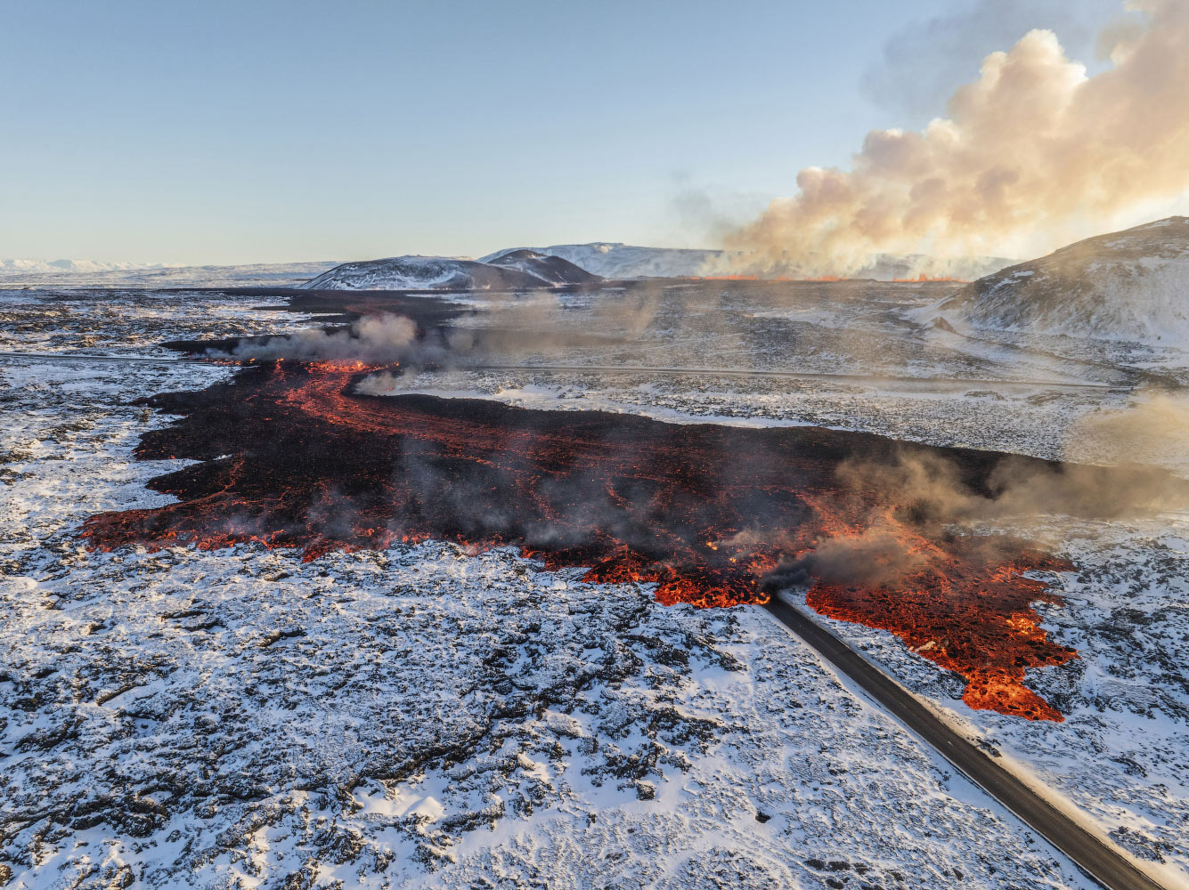 Вид с воздуха на вулканическую активность действующего вулкана в Гриндавике на исландском полуострове Рейкьянес. (Фото Marco Di Marco):