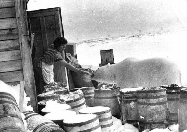 Женщина подкармливает белого медведя, СССР, 1950 год.