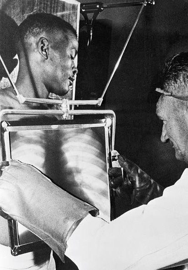 Рабочий алмазных шахт в конце каждой смены проходит проверку рентгеном перед тем как покинуть шахты. ЮАР, 1954 год.