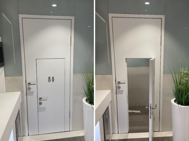 В этой ванной комнате есть маленькая дверь для детей, встроенная в дверь обычного размера