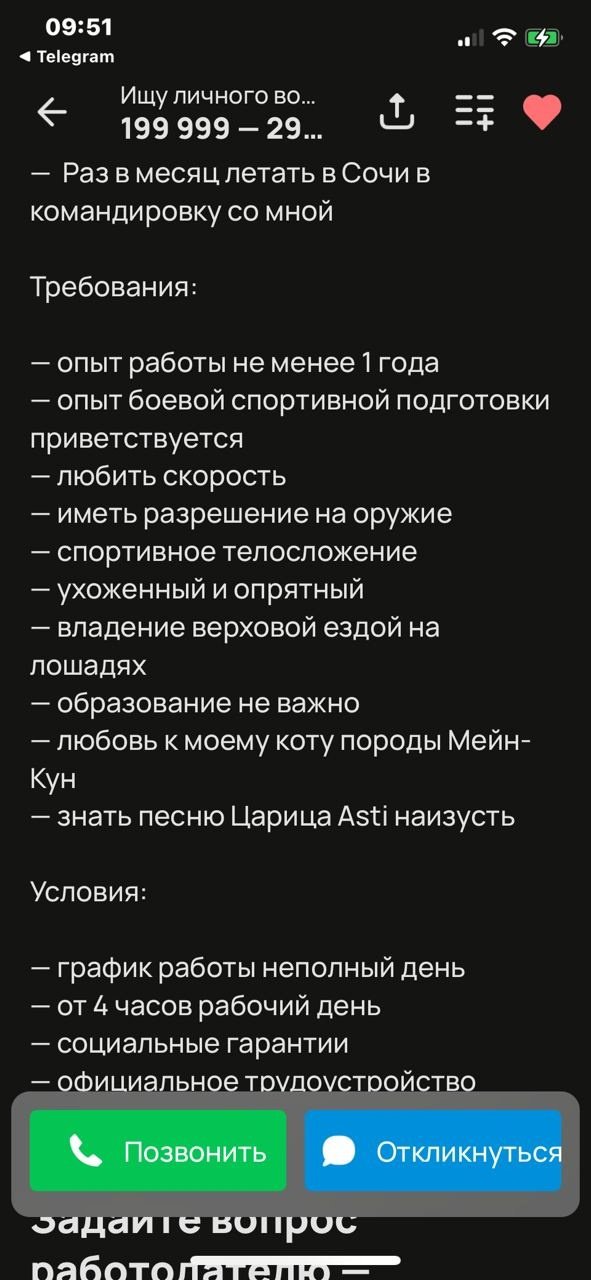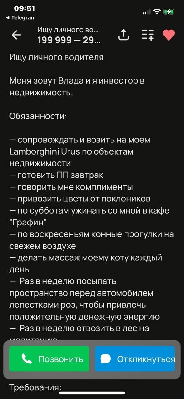 Вакансия дня: работа личным водителем 18/04/2024 17:00 Итак, если у вас есть права, имеется спортивная боевая подготовка, а также спортивное телосложение, то работа для вас. Ах, да. Еще нужно знать наизусть песню "Царица". Главная / Картинки 0 Admin 3 331
