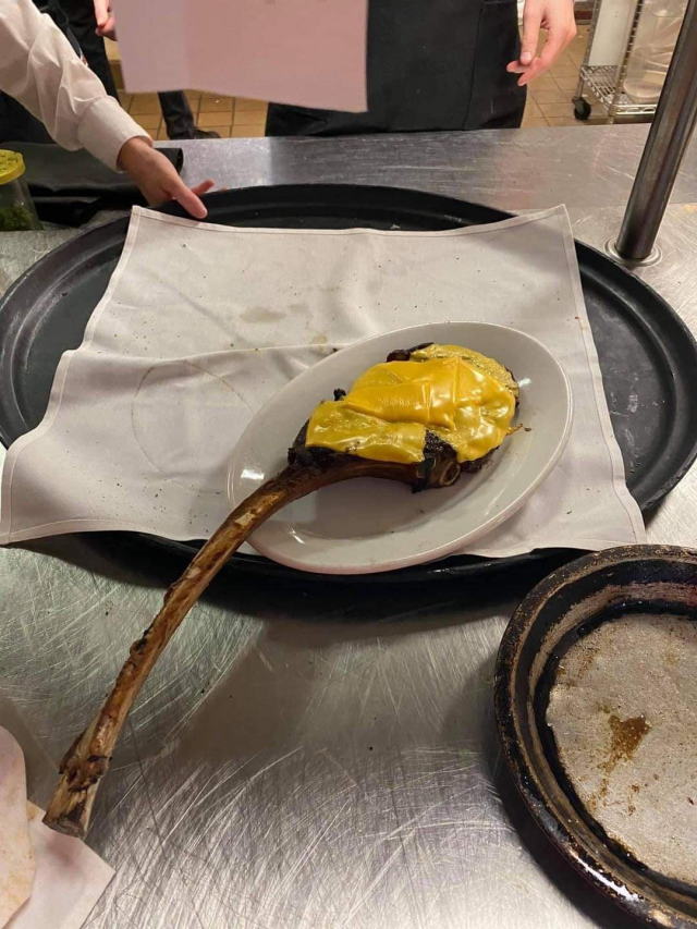 Пережаренный стейк на кости с сыром