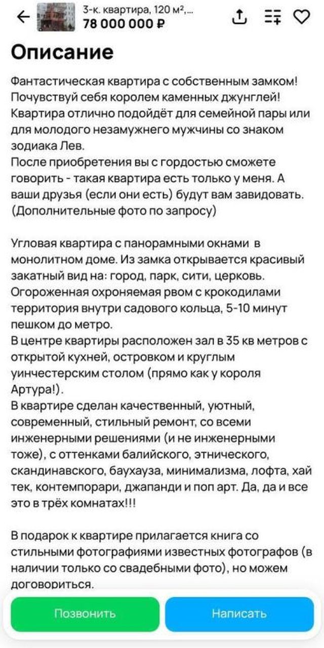 Но не думайте, что барон... то есть "продавец", отдаст свой замок кому попало. Да, цена демократичная, но есть условия. Владелец замка уточняет, что идеальными покупателями он видит – мужчину, Льва по гороскопу. Ну или семейную пару на крайний случай.