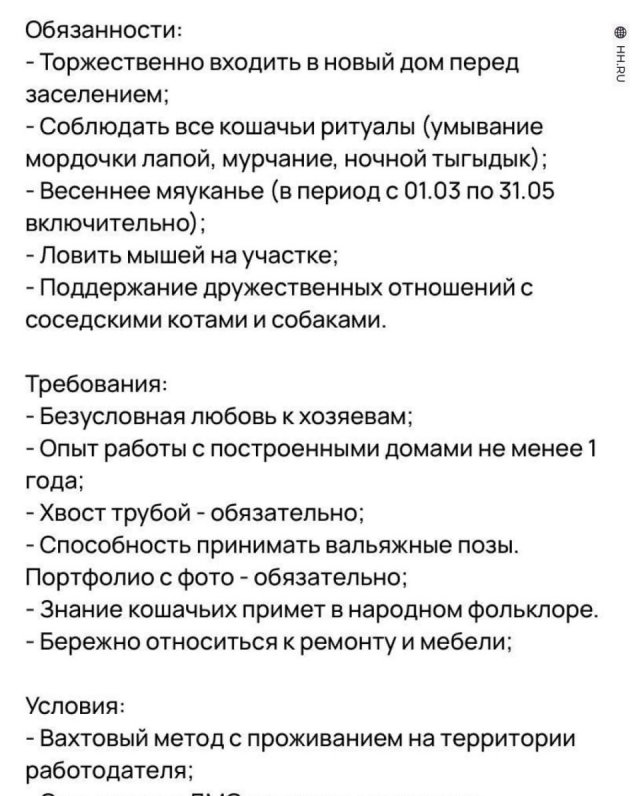 Работа мечты: кот для новоселья 23/04/2024 16:00 Все же помнят, что когда отмечают новоселье, то изначально в дом пускают кошку. А что делать, если ее нет? Найти "кота для новоселья". Главная / Картинки 0 Admin 0 83