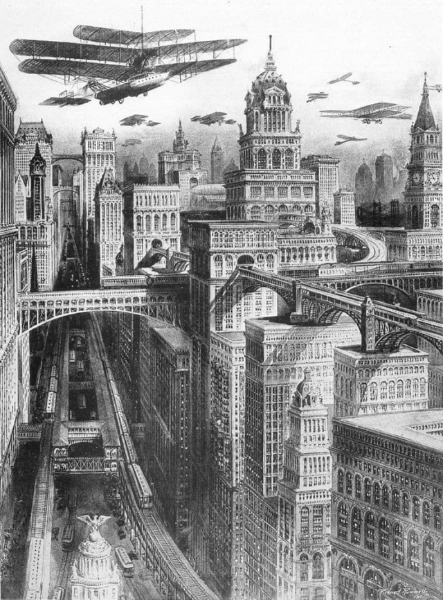 Будущий Манхэттен, Нью-Йорк. Рисунок Ричарда Раммелла, 1910-е годы.